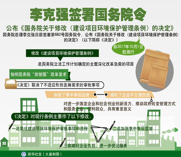 國務院總理李克強日前簽署第682號國務院令,公布《國務院關于修改〈建設項目環境保護管理條例〉的決定》(以下簡稱《決定》),自2017年10月1日起施行!