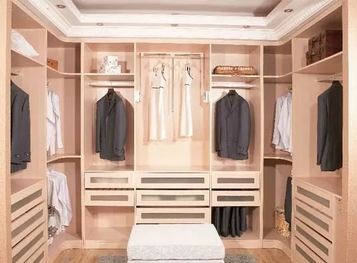 “先天條件不足”的衣帽間,可以通過巧妙的空間布局來安排:正方形衣帽間多采用U型布局,小尺寸應該控制在長寬比例為2.5m*1.5m左右。如果空間夠大,也可以做得更大一點。